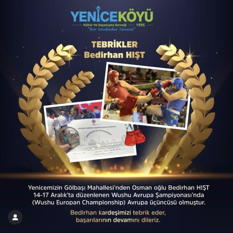 Yenicemizin Gölbaşı Mahallesinden Osman oğlu Bedirhan Hışt 14-17 Aralık’ta düzenlenen Wushu Avrupa Şampiyonasında (80kg Kategorisi)(Wushu europan championship) Avrupa üçüncüsü olmuştur.????